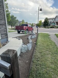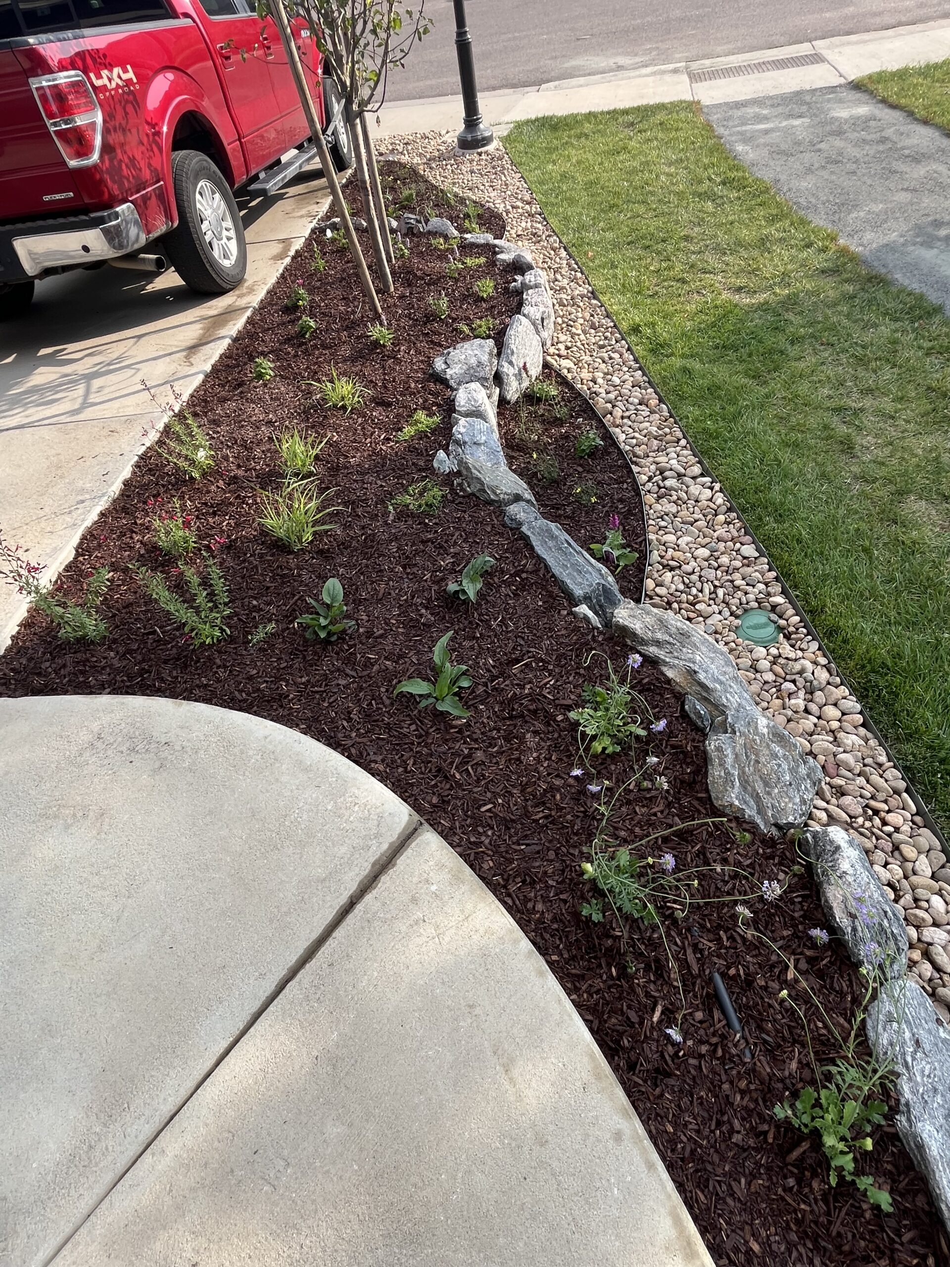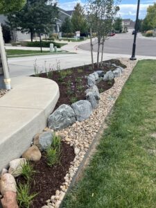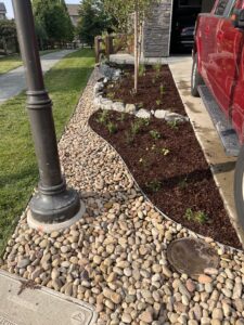The project was well-supported by the city of Loveland and the Resource Central team. They were so helpful in the process and very professional in their communications and actions. The pictures represent the transformation from March to August 2024. Now, in August, the plants are thriving, even after a devastating hail storm in late July. I would suggest working extra hard to make sure grass doesn’t try to regrow, as well as to add some root stimulator to the plants shortly after planting. We converted a sprinkler zone to a drip and that was not difficult either, after watching some videos. I bought all materials locally, including fabric, edging, rock, and pavers. So happy with the overall results and saving water as well.